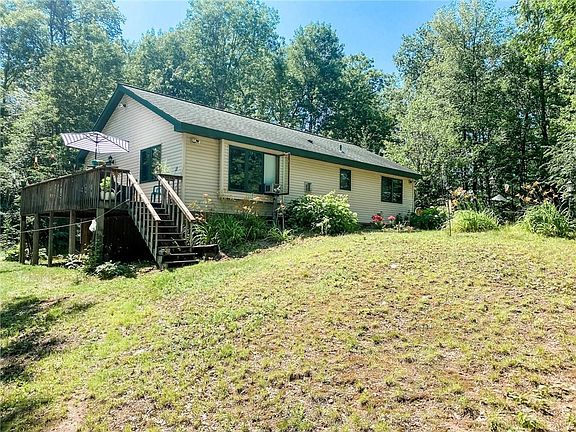 This location is ideal for peace and quiet seekers. Enjoy the private and scenic shoreline with boatable access over to the main portion of lake to swim. Main floor master bedroom w/private bath and deck, open and inviting living room/kitchen/dining with large island for gathering and corner fireplace. Walkout lower level ready to finish with more bedrooms, family room, etc. 30 x 40 garage. Located on dead end private road off the beaten path to protect your privacy, but w/in 5 min of Hwy 53.