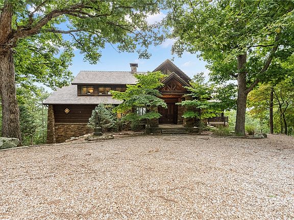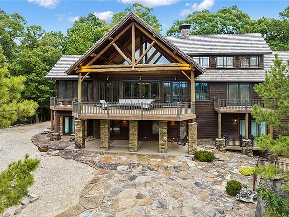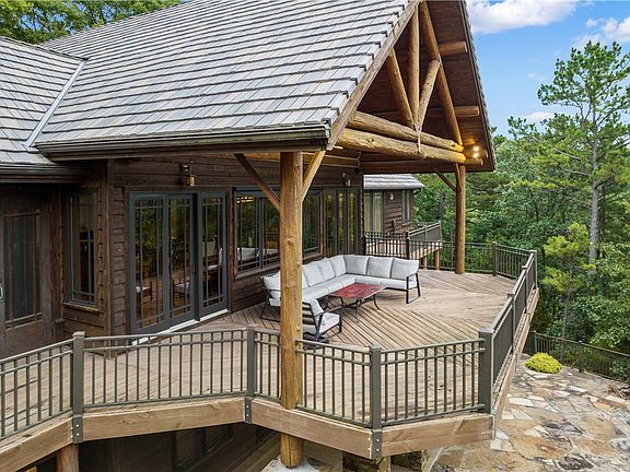 "The HIDEOUT" - This architecturally designed lake house is quality finished with attention to detail! Nestled right on Beaver Lake on its own private point, this beautiful craftsman-style home is covered with log accents, cedar and rock. On 3.85 acres, this home includes a 1,000 ft shoreline, a private 2 slip dock with a swim platform, and a property gate with external surveillance. Entire primary floor equipped with automatic electric awning/blinds. Special features in the home include Australian Cypress floors, solid alder doors, wood windows, granite, travertine, has a large exterior upper deck, patios outside each bedroom, and a lovely screened porch. You will not want to miss the 16x14 office with windows, vaulting, with a one of a kind lake view! 20 min to Rogers.