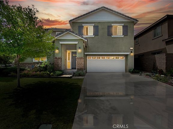 Welcome home to 16759 Fern Lane in Fontana. This beautifully presented residence is nestled in the heart of the desirable Bella Strada community. Built with modern luxuries and comfort in mind, the thoughtfully designed layout boasts 4 bedrooms, 3 total bathrooms, and 2,188 square feet of spacious living. The inviting curb appeal evokes a welcoming first impression with manicured landscaping, a charming façade, and a prominent corner-lot presence. Upon entering, elegant tile flooring flows throughout the main living areas while plush carpeting provides added comfort. Plantation shutters and a soft neutral pallet enhance the aesthetics of the impressive interior. A main level bedroom off the entry offers versatility for a home office or guest quarters. Bathed in natural light, the living room is adorned with sparkling windows, capturing picturesque views of the outdoors while seamlessly segueing into the adjacent dining room. The open concept kitchen is a dream, complete with sleek granite countertops, stainless steel appliances, and a stacked-stone backsplash. The custom trend of alfresco entertaining is effortless with direct access to the patio from the dining area. Completing the footprint of the well-appointed ground floor is a powder room, conveniently located in an accessible area for visitors. Adding to the home's appeal is a quaint alcove upstairs, perfect for use as a reading nook, study area, or cozy media space. The oversized primary bedroom features a luxurious ensuite bathroom and dual walk-in closets, creating the ultimate haven for rest and relaxation. Two additional guest bedrooms are in close proximity to a tasteful full bathroom, ensuring ample space and privacy. A dedicated laundry room adds ease and efficiency to streamline daily routines. The backyard is a cohesive extension of the home, showcasing exquisite stamped concrete and a large covered patio with ceiling fans. Fruit trees, lush landscaping, and a peaceful garden along the side yard elevate the natural elements of the stunning exterior. Bella Strada encompasses a vibrant community with a wealth of resort-style amenities. Residents enjoy access to a sparkling community pool, well-equipped BBQ stations, a welcoming clubhouse, and a family friendly park. Fostering a close-knit neighborhood atmosphere, Bella Strada harmoniously blends recreation and leisure. This home truly has it all so come and experience the unparalleled opportunity that awaits.