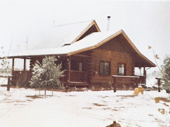 At the front of the property stands a striking **log cabin-style home**, exuding rustic character and a true Western feel—something seldom found in this area. Adjacent to the main cabin is a **cozy casita**, complete with a small bedroom and bathroom—ideal for guests, a home office, or a quiet writing space.