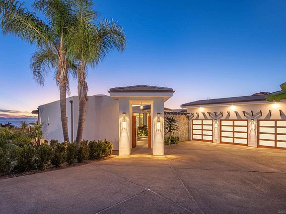 Panoramic ocean, bay, and coastline views abound from this recently renovated soft-contemporary home in Los Altos Estates, a discrete and gated enclave of eight luxury homes on the sunny side of Mount Soledad. Captivating sunsets and blue water are visible from all of the primary entertaining and living spaces in this home, and an open floor plan with an expansive wrap around terrace allows living, dining, and cooking to flow seamlessly together on the entry level. Home features 4 bedrooms, 3.5 bathrooms, and 2 bonus rooms which are currently used as fitness and theater rooms. The primary suite, also on the entry level, enjoys a private wing with sensational south and west views from bedroom, bathroom, and terrace. Views continue from the downstairs bedrooms and also from a lower fire pit lounge in the backyard. Nearly 17,000 sqft of land provides plenty of space to play and a future pool. Additional features include AC, owned solar, 3-car attached garage, large driveway, wine cellar, wet bar, and more. Shared amenities include a multi-sport court, pool, spa, and clubhouse. Los Altos Estates is a few blocks from Kate Sessions Park and 1.5 miles to the ocean.