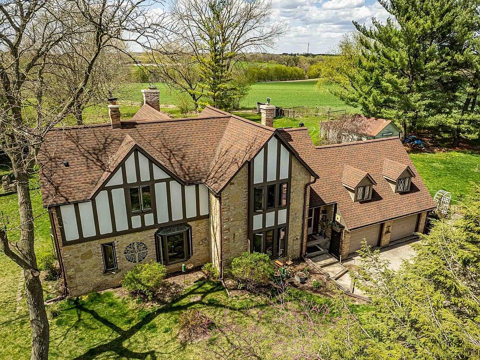 One of a kind 3,100 sq. ft stone & stuco tudor is set on a private 2+ acre lot minutes from Sun Prairie. You will love the 2 story great rm w/hand hued beams, lofted sitting area & floor to ceiling FP. The updated kitchen boasts 2 pantries, breakfast nook, open hearth FP & granite tops. The formal dining features beamed ceiling & hrdwd floors and the 1st floor also features an office/den & updated bath w/laundry. The primary BR features ensuite bath w/tile shower, large soaking tub & private deck. BR 3 is a private suite w/1/2 bath, fam room & private deck. The private homesite is surrounded by trees & hundreds of perennials, there's a large garden shed, a stamped patio and the exterior has custom stonework completed by artisan craftsmen. A must see!