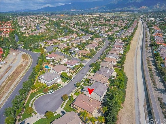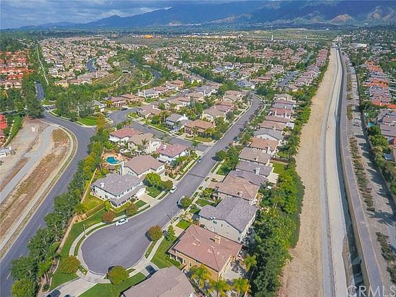 This lovely, two-story, cul-de-sac home is located in the Legacy tract in the Colonies. This tract does not have the high Mello Roos tax. The home has no neighbors directly behind as it backs up to the Cucamonga Creek Trail. Enter the front door to a custom tiled foyer and formal living room with high ceilings and hardwood floors. A partition wall divides the foyer and the dining room. The kitchen is equipped with plenty of storage, granite island, counters and back splash, and stainless appliances including a double oven and five burner gas stove. An attractive pantry with upper glass cabinet door upgrades connects the kitchen and dining room. A spacious main-floor master suite boasts private access to the tastefully landscaped backyard. The master suite is also equipped with two spacious closets. The master bathroom boasts a relaxing jetted, soaking tub, separate walk-in shower, dual sinks and a separate toilet room. Upstairs boasts new carpet throughout the two spacious bedrooms, built-in tech area upgrade, and an expansive bonus room that can function as an additional bedroom. The upstairs bathroom has dual sinks and a separate bath tub and toilet room. A laundry room with a sink and more upper cabinet upgrades leads to the 3-car tandem garage. The house has been repainted inside and out. The home has easy access to the 210 freeway, shopping and California Distinguished schools.