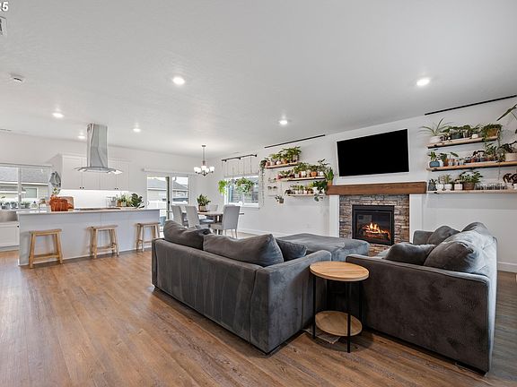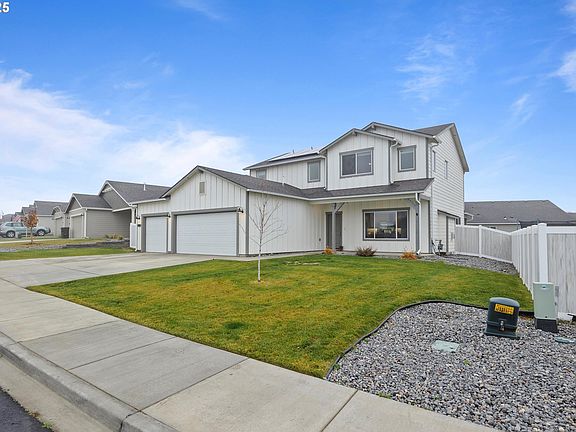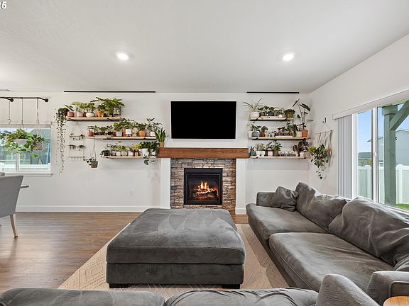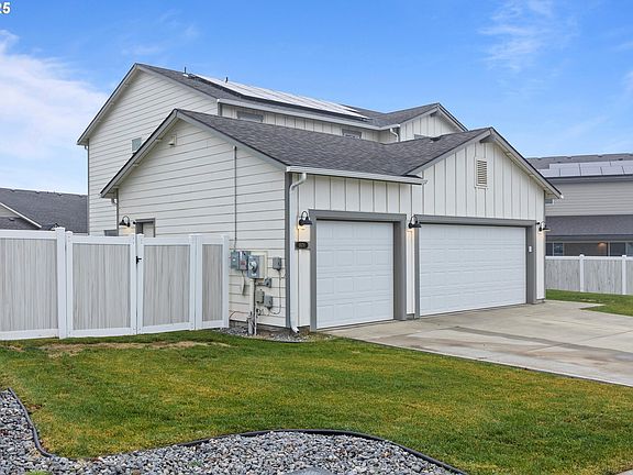 Energy-efficient and beautifully upgraded, this like-new 2024 Monte Vista home offers space, comfort, and modern design throughout. Featuring 4 bedrooms with the primary suite on the main floor, this home includes a walk-in closet, dual quartz vanities, large walk-in shower, and separate soaking tub. LVP flooring extends through the kitchen, dining, and living areas for easy maintenance, while carpeted bedrooms add warmth. The main living room features a cozy gas fireplace, and an oversized upstairs great room provides a perfect second living area for entertainment, hobbies, or movie nights. The stunning kitchen includes quartz countertops, full backsplash, spacious walk-in pantry, stainless steel appliances, gas cooktop with range hood, built-in microwave, deep farm sink, and a large island ideal for prep and gathering. A convenient half bath serves the main level. Upstairs offers three additional bedrooms, a full bath with dual quartz vanities, tub/shower combo, and a walk-in laundry room with storage and folding counter. A fully insulated 3-car garage offers parking and flexible storage or workspace.Outdoor living includes a fully fenced yard, covered patio with lighting, and gas hookup ready for grilling. This home also includes over $30,000 in owned solar equipment, providing a family of 4 an average electrical bill of $17 per month! Move-in ready and thoughtfully designed, this home offers comfort, value, and room to grow.