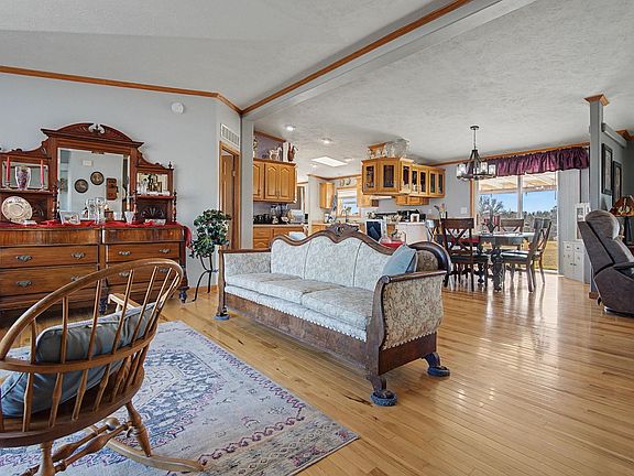 Set on 4 acres in a stunning country setting, this property offers spectacular 360-degree views. The home features a spacious country kitchen with breakfast bar and a very open floor plan, all in excellent condition. A UBC-built home with a new roof (2016) and a new gas hot water heater (2020), it also showcases beautiful hardwood floors and a cozy fireplace in the family room. Outside, you’ll find a newer detached 3-car shop with workshop, two storage sheds, and RV parking with water, power, and dump hookups. The landscaped backyard includes a large 30’ x 12’ covered patio with a gas grill hookup—perfect for enjoying the peaceful surroundings. The lower acreage borders a wash area, attracting abundant wildlife. All farm equipment, yard art, corral panels, and carousel horse are excluded.