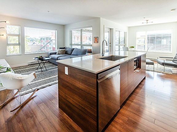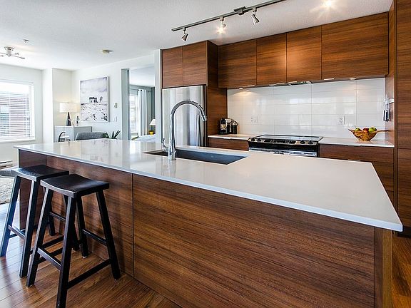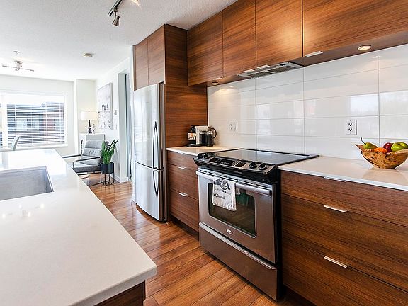 THE BEST CORNER UNIT offering S/E exposure, w oversized windows for loads of natural light. This well thought-out flr plan has a unique open concept living space w 2 good sized bedrms that are well separated. Gourmet kitch w quartz countertops, lg island w seating for 4, SS appliances & pantry. Spa primary ensuite w deep soaker tub, sep glass shower & lots of counter space. Second bedrm has bath w shower & murphy bed. A spacious, private balcony for BBQs or green thumbs. Freshly painted w attractive panelling in kitchen creates a great canvas. In suite laundry. Pets welcome w lovely trails very close by. Well equipped gym, party rm & bike room in building. Shopping, trails, restaurants & transit all a short walk away. 1 parking, 1 locker & bike storage. OPEN SAT OCT 4TH 2-4