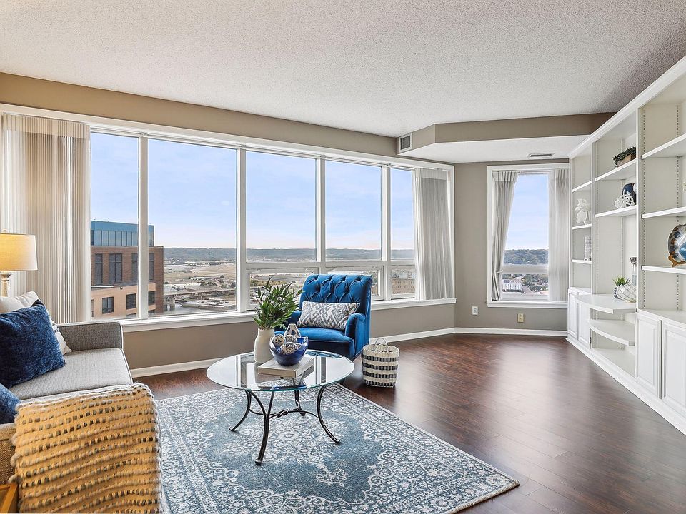 Stunning views of the Mississippi and downtown St. Paul from this peaceful condo perched on the 32nd floor of the skyway-connected Airye! This condominium features an updated kitchen with quartz countertops, new flooring, and a tasteful new primary en suite bathroom. Enjoy climate-controlled access to downtown via the skyway system – or stay home and bask in views of streetscapes, barges on the river, and small plane traffic at the downtown St. Paul airport. Mears Park is steps from the front door with a beloved summer music in the park concert series and the Farmer's Market and CHS Field are a few blocks away. Secure garage parking spot is just an elevator ride away.