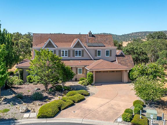 Live the golfer's dream in this spectacular 4-bedroom, 4-bathroom estate nestled on a quiet cul-de-sac overlooking the 17th tee box at Copper Valley Golf Course. Sweeping golf course and mountain vistas provide the perfect backdrop for your own private paradise. Entertain in style with a large open floor plan featuring a spacious great room, perfect for gatherings. The gourmet kitchen boasts ample counter space and a dedicated coffee bar, ideal for mornings on the course. Luxury vinyl flooring flows seamlessly throughout the home, creating a modern and easy-to-maintain ambiance. Unwind after a day on the green in one of the two ensuites, offering luxurious sanctuaries. The additional two bedrooms ensure comfortable accommodations for family and guests. Peace of mind comes standard with a fully paid-for solar system, reducing your energy costs and environmental impact. Plus, a dedicated golf cart garage keeps your essential fairway companion conveniently stored. This exceptional residence offers the perfect blend of luxury living, breathtaking views, and effortless entertaining. This property also includes with the sale of this home, a lot in Copper Cove allowing you access to Lake Tulloch for your boating, swimming and entertainment needs. Don't miss your chance to own a piece of paradise!