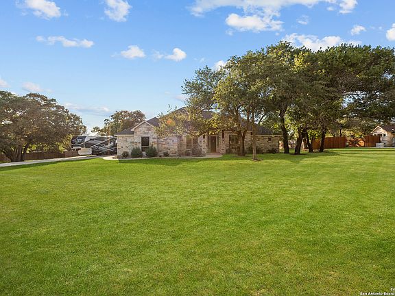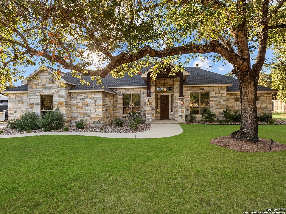 Located in the sought-after Eden Crossing community, this custom one-story home sits on 1.23 acres and is loaded with thoughtful upgrades. Offering 4 bedrooms, 2.5 baths, and 2,853 sq. ft., the residence showcases soaring 15-ft ceilings, 8-ft doors, and porcelain tile flooring throughout, creating an open and elegant feel. At the heart of the home, the chef's kitchen features dual oversized islands, granite counters, walk-in pantry, and premium KitchenAid Red Dot Series appliances - blending style and performance. A dedicated office/flex room adds versatility to the layout. The private primary suite offers tray ceilings, plantation shutters, and a spa-style bath with dual vanities, garden tub, separate shower, and two walk-in closets with custom built-ins. Secondary bedrooms include coffered ceilings and walk-in closets. Outdoor living includes an oversized covered patio with a wood ceiling, TV outlet, and pre-wired sound. The oversized 3-car garage (1,044 sq. ft., 27 ft deep with commercial insulated doors) offers attic storage, upgraded lighting, and a 30-amp RV outlet with waste drain. Additional features include XPel window tint, tankless water heater, sprinkler system, smart fiber wiring, full security system, water softener plumbing, and a widened 16-ft driveway. Community amenities include a stocked pond, walking trails, and park. Zoned to La Vernia ISD, with GVEC fiber internet and an easy commute to San Antonio, Fort Sam Houston, and Randolph AFB, this property delivers both convenience and countryside living.