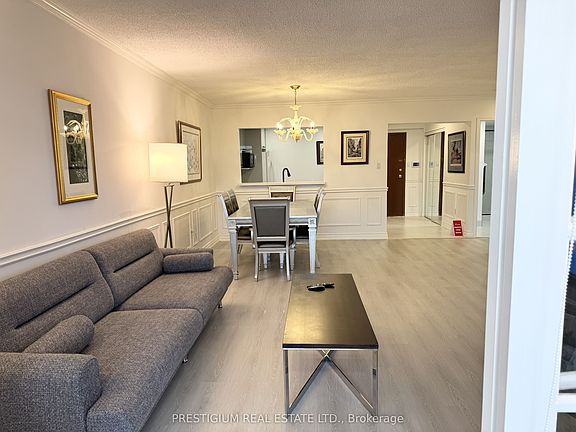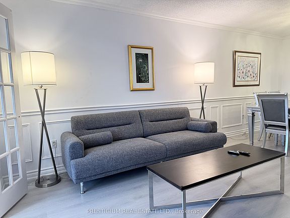 Spacious 1+sunroom condo ideal for mature residents. Features hardwood floors, wainscoting, and a large open-concept living/dining area. The big sunroom can be used as a second bedroom or office and has access to the balcony. This unit offers plenty of natural light and includes an in-suite washer/dryer, a 3-piece bath, and a modern kitchen with updated appliances. Comes fully furnished with quality pieces including a couch, dining set, bedroom set, and large TV. Newly renovated and move-in ready.Enjoy resort-style amenities: indoor pool, sauna, hot tub, game and card rooms, billiards and ping-pong rooms, dance room, squash court, 24-hour gatehouse security, and 5-day concierge service.Close to Agincourt Mall, library, and professional services, with easy TTC access. Quiet, well-maintained building perfect for mature residents seeking comfort and convenience.