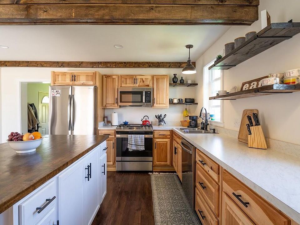 Walk-in closetExposed beam ceilingsOversized fenced yardStainless steel appliancesOpen-concept layoutCovered front porchSpacious main-floor primary suite