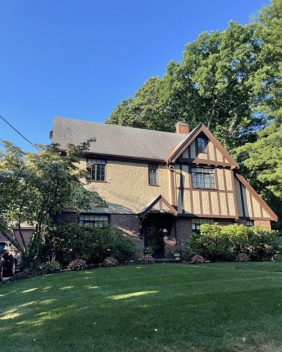 A classic, much admired iconic Tudor style home with terrific in-town location. This home has been significantly updated celebrating the charm of the original historic architectural details. Enter through old world plank door with iron trim. First floor includes a beamed-ceiling living room with stucco fireplace, a renovated kitchen with counter seating plus breakfast room as well as a formal dining area which opens to the family room. There is also a home office with built in cabinets, a large laundry room with lots of storage, a mud room and half bath. Second floor has 4 spacious bedrooms including primary suite with sitting room, Hall bath with double vanity has been nicely renovated. Walk up third floor is finished with bedroom and office space. Lower level has playroom as well as guest suite, bath and private entrance. Yard is enhanced with sports court & patio. Easy walk to train & town center. This home provides charm and comfortable living!
