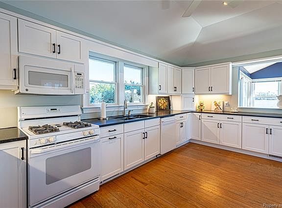There is waterfront property and then there is THIS! Beautiful home, close to town, gorgeous views. What more could you ask! Home has panoramic views of the Bay down Tabbs Creek from every room. Enjoy breathtaking sunrises from one porch and sunsets from another! Crown molding, special lighting and beautiful wide plank pine floors are features of this lovely home. Living room with marble inlay fireplace opens to a gorgeous sun porch that runs the entire length of the house. This all-season porch has sliding glass doors that can be opened to make a screened porch. Newly renovated large kitchen has granite "leathered" countertops. There is another sun porch off the dining room with stunning views. Dining room has tray ceiling with recessed lighting. Master bedroom suite also opens out to the sun porch. Upstairs you will find two bedrooms flooded with natural light and a full, shared bath. Downstairs there is a sitting room, another sun porch, full bath and rec room. Front stairs lead up to lovely covered front porch. There is a two car attached garage, generator, double decker shed and dock with 5+ feet of water.