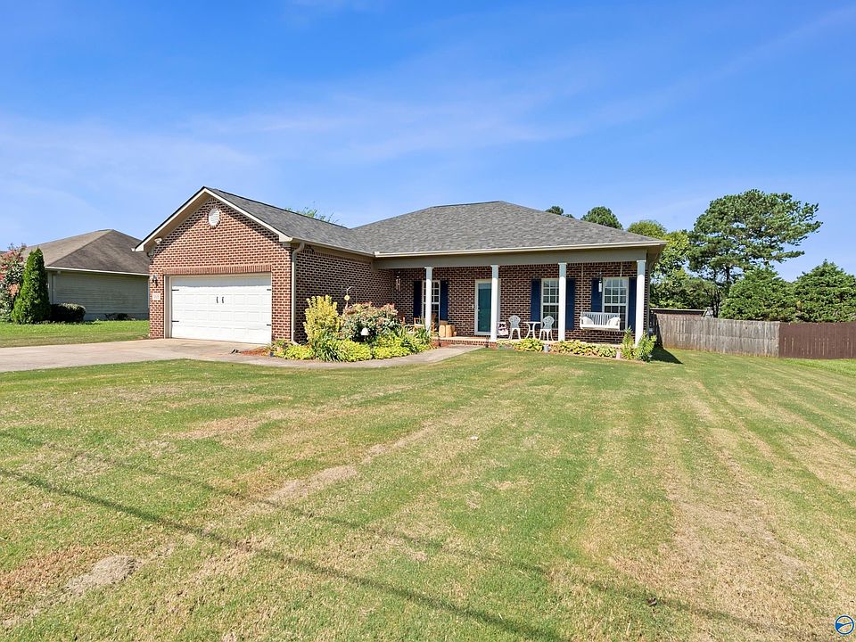 Discover refined comfort in this beautifully maintained 3-bedroom, 2-bath full brick home, nestled on a serene half-acre lot in an established, quiet subdivision. The spacious primary suite offers a private sitting area and a spa-inspired bath featuring a custom walk-in tile shower, granite countertops, and tile surround garden tub. Step into the backyard oasis-complete with a sparkling above-ground pool, flourishing garden, cozy fire pit, and a charming chicken coop- designed for both relaxation and entertaining. A perfect blend of elegance, functionality, and outdoor living awaits!