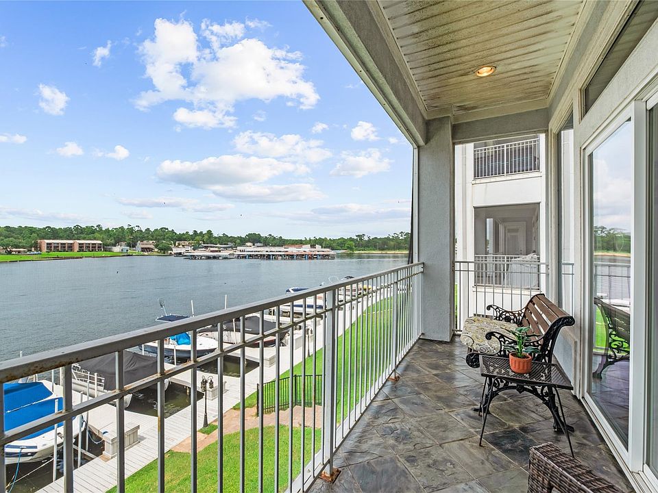 Don't miss the opportunity to LIVE AND PLAY on Lake Conroe! Complete with your own boat slip and lift, community pool with infinity edge and next to on the lake dining and shopping! Gated community in the "heart of the action" for the lake. This corner unit has fantastic views and is a north/south unit with stair and elevator access to the second floor. Tile floors throughout with carpet in the bedrooms. Stacked washer and dryer are included as well as a 2021 stainless steel refrigerator. A/C was replaced in 2020 and water heater in 2021. Lift motor and remote boat lift replaced in 2024 as well as the dock lighting. Roof was replaced in 2023. Large storage unit included with unit just outside the front door.