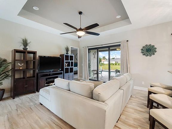 Welcome to your dream home on a freshwater canal in the highly desirable beach and golf community of Rotonda West! Built in 2021, this custom 3-bedroom, 2-bath pool home showcases quality craftsmanship and thoughtful design from the moment you arrive. The inviting coach-light driveway, shiplap-accented exterior, and welcoming front porch with double-door entry set the tone for what’s inside. Step through the doors to discover soaring volume ceilings, 8-foot doors, and elegant porcelain plank flooring throughout. The living room features an impressive tray ceiling with recessed lighting, a 6-foot ceiling fan, and a three-panel sliding glass door that opens seamlessly to the covered lanai—creating the perfect indoor-outdoor Florida lifestyle. At the heart of the home, the chef’s kitchen offers solid wood, soft-close cabinetry, stunning granite countertops, a tile backsplash, stainless steel appliances, and a walk-in pantry. With its own pool access and open layout, it’s ideal for entertaining and everyday living alike. Step outside to your private tropical oasis! The sparkling heated pool features a 6-foot sun shelf, perfect for lounging, cooling off, or letting little ones splash and play. On cooler days, the pool heater adds a touch of luxury and extends your swimming season year-round. The full-width paver pool deck overlooks the tranquil freshwater canal—the ideal backdrop for morning coffee or sunset cocktails. This home was built for longevity and peace of mind, engineered by a reputable Florida builder to exceed standards for strength and efficiency. Highlights include: • Hip roof design for enhanced wind resistance and lower insurance rates • Off-ridge roof venting for storm protection • STEM WALL construction for superior foundation durability • Kevlar electric roll-down hurricane shutter across the lanai (see-through for light and visibility) • NO FLOOD INSURANCE REQUIRED. With its low-maintenance design, low insurance costs, and a $190/year HOA fee, this property offers affordable luxury and true peace of mind. Rotonda West residents enjoy five championship golf courses, a community park and center, and easy access to world-class beaches, marinas, and boat launches—all just minutes away. At 1,700 square feet under air, this home lives large thanks to its open concept and volume ceilings. Furniture is optional, allowing for a turnkey move-in opportunity. Priced to sell, this stunning canal-front home is the perfect blend of quality, comfort, and coastal living. Don’t wait—schedule your private showing today!