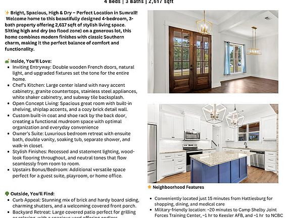 Step into 168 N Bryant Rd in Sumrall and you are not just walking into a home, you are walking straight into equity. This 4 bedroom, 3 bath stunner offers 2,617 sqft of high design living space and is priced below comparables, giving you room to build wealth from day one. From the moment you enter through the double French doors, natural light fills the home and sets the stage for spaces that feel both sophisticated and inviting. The kitchen takes center stage with navy cabinetry, granite counters, stainless steel appliances, a walk in pantry, and an island designed for gathering. The open living area balances modern character with warmth as built ins, shiplap, and a brick accent wall create a focal point that feels curated yet comfortable. The owner's suite is a private retreat with a spa like bath, while the upstairs bedroom adds even more space for family, guests, or a home office. Outside, the home sits on a private lot surrounded by greenery, offering a sense of seclusion without sacrificing convenience.