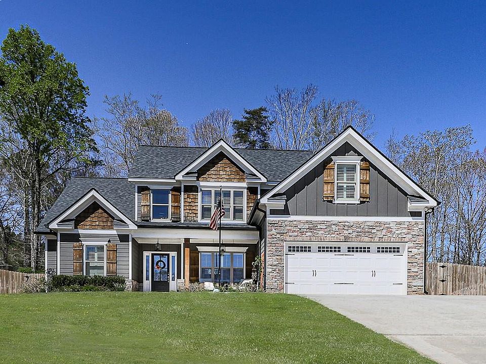 Welcome to your oasis! This Craftsman home offers a signature handcrafted look with a mix of natural stone and wood! Discover attention to detail both inside and out! Not only is this home nestled on a beautiful CUL-DE-SAC LOT, it is beautifully landscaped with an irrigation system to make keeping a lush yard easy! Long drive way and extra parking pad to accommodate all your needs! Enjoy the scenery while sitting on the rocking chair front porch or head out back to a fenced backyard OUTDOOR OASIS! Meticulously designed to blend relaxation, entertainment, and privacy into one seamless experience. At its heart, a cozy, stone fireplace that stands as a focal point, offering warmth and a mesmerizing glow during cooler evenings. Just a few steps away, a luxurious hot tub promises a private retreat under the stars. The covered patio is great for all weather! Backyard storage shed is perfect for extra storage or yard equipment! Inside, a welcoming two story foyer welcomes you home! Large dining room with coffered ceiling makes a beautiful place for holiday gatherings! The heart of the home is a large, open-concept kitchen designed to cater to both the serious chef and the family gathering spot! Plenty of cabinets for ample storage! Granite countertops, stainless appliances, large island and spacious pantry make this a space you will not want to leave! Kitchen views a spacious two story family room with stone fireplace! Main level owner's suite with a trey ceiling and lots of natural light! Gorgeous ensuite with double vanity, walk-in shower and separate soaking tub! LARGE secondary bedrooms can easily accommodate queen or king size beds. Amazing closet and storage space throughout! This home is loaded with amazing features and upgrades! A short distance to Downtown Ball Ground with dining, breweries, shopping and more! Minutes to the interstate for an easy commute! EXCELLENT school district! You won't want to miss this one!