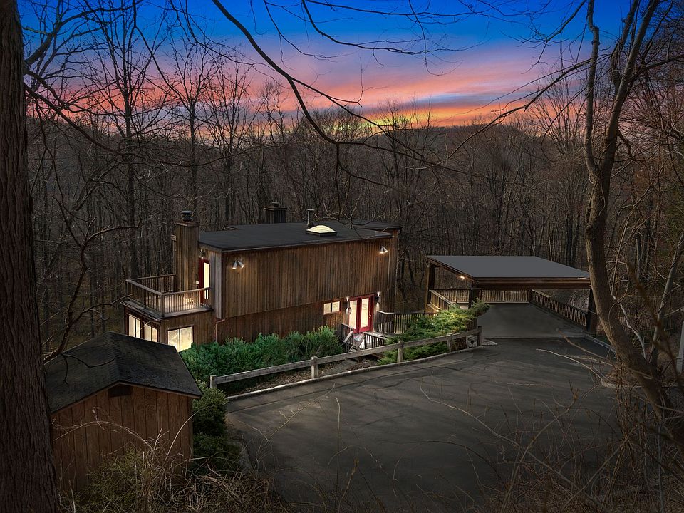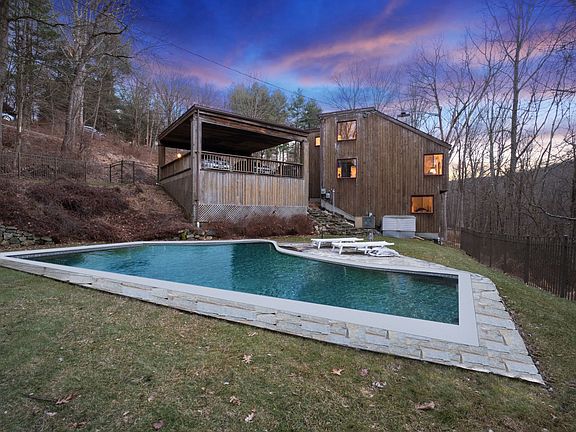 Beautifully set on 2.3 park-like acres and abutting Pound Ridge Reservation, this beautifully maintained modern home with inground gunite pool offers much tranquility. This Pound Ridge retreat is awaiting your own personal touches. An expansive living room with walls of windows and fireplace, and a formal dining room flow beautifully for entertaining on grand and intimate scales. Both lead to the sun drenched kitchen that opens to tiered outer decks. The second level offers a large master bedroom and bathroom suite plus sitting room and walk-in closet. There are two additional bedrooms and bath plus family room leading out to deck in the lower level. Central Air and 5 zone oil heat with above ground oil tank. Landscape lighting by Mark. Perfection.