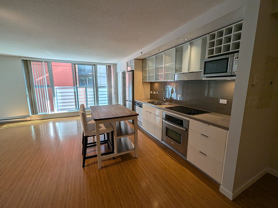 Welcome home to the SMART building in Gastown. SMART brings a modern, European feel to Gastown and this condo is no exception. Designed by architects Perkins & Will, this condo features bamboo flooring throughout, over-height ceilings, floor-to-ceiling windows, and a Juliet balcony that allows ample natural light to flow throughout. The gourmet kitchen offers custom cabinetry, quartz countertops, high-end stainless steel appliances, and an island. Residents of the SMART building have access to an array of amenities such as a fitness centre, yoga studio, workshop, and bike room.