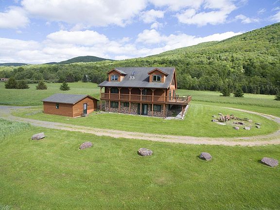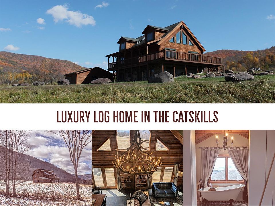 Spectacular VIEWS await you at this PRIVATE CATSKILL RETREAT just minutes from Roxbury. This LUXURY LOG on over 21 acres offers all the comforts you can imagine on 3 LEVELS of spacious living. The first floor Living with OPEN FLOOR PLAN connects the Living Area to the NEWLY REMODELED KITCHEN and dining area and is great for entertaining while cooking. There are two spacious bedrooms and a FULL BATH on the first floor. The MASTER SUITE is located off the loft area on the second floor has a NEWLY REMODELED ENSUITE bathroom with CLAW-FOOT TUB, Walk-in Glass Shower and Double Sink. The lower level has a LARGE MEDIA/ENTERTAINMENT ROOM with WET-BAR a 4th bedroom and 3rd full bath with CUSTOM RIVER ROCK walk-in Glass shower. Radiant heat floors throughout enables a comfortable temperature anywhere in the home. The property has a 2 car garage with TESLA charger. The expansive manicured grounds are wonderful for quiet relaxation or for group activity. Prepare an outdoor feast, lounge on the decks or enjoy the warmth of the CUSTOM BUILT STONE FIRE-PIT while looking at the stars. This Luxury Log defines COMFORT with STYLE and is the perfect place to get-away, yet close to hip Catskill Towns. Minutes to great Farm-to-Table Restaurants, Shops, Skiing, Hiking, Fishing and all the greatness the Catskills has to offer. This property is offered fully furnished and is a great vacation rental property.