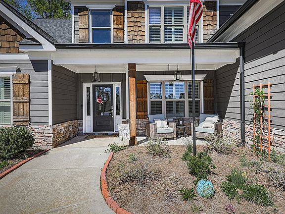 Welcome to your oasis! This Craftsman home offers a signature handcrafted look with a mix of natural stone and wood! Discover attention to detail both inside and out! Not only is this home nestled on a beautiful CUL-DE-SAC LOT, it is beautifully landscaped with an irrigation system to make keeping a lush yard easy! Long drive way and extra parking pad to accommodate all your needs! Enjoy the scenery while sitting on the rocking chair front porch or head out back to a fenced backyard OUTDOOR OASIS! Meticulously designed to blend relaxation, entertainment, and privacy into one seamless experience. At its heart, a cozy, stone fireplace that stands as a focal point, offering warmth and a mesmerizing glow during cooler evenings. Just a few steps away, a luxurious hot tub promises a private retreat under the stars. The covered patio is great for all weather! Backyard storage shed is perfect for extra storage or yard equipment! Inside, a welcoming two story foyer welcomes you home! Large dining room with coffered ceiling makes a beautiful place for holiday gatherings! The heart of the home is a large, open-concept kitchen designed to cater to both the serious chef and the family gathering spot! Plenty of cabinets for ample storage! Granite countertops, stainless appliances, large island and spacious pantry make this a space you will not want to leave! Kitchen views a spacious two story family room with stone fireplace! Main level owner's suite with a trey ceiling and lots of natural light! Gorgeous ensuite with double vanity, walk-in shower and separate soaking tub! LARGE secondary bedrooms can easily accommodate queen or king size beds. Amazing closet and storage space throughout! This home is loaded with amazing features and upgrades! A short distance to Downtown Ball Ground with dining, breweries, shopping and more! Minutes to the interstate for an easy commute! EXCELLENT school district! You won't want to miss this one!