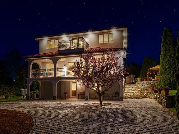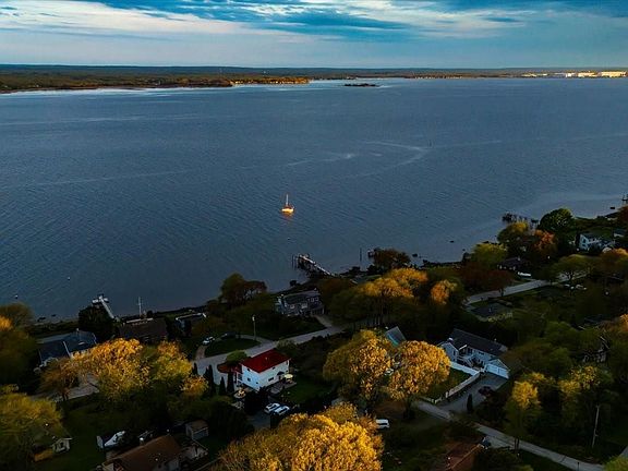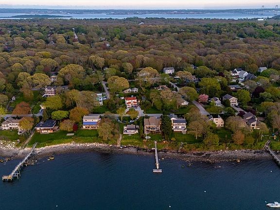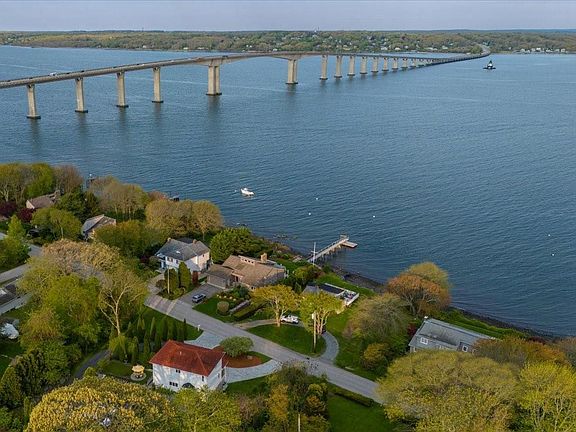In 2005, the cottage on this water view property was reimagined and this stunning, sun-swept seaside villa was built and incorporated a new second floor. Designed to capture the beautiful, ever-changing water, sunrise and sunset views over the West Passage of Narragansett Bay, it was created to blend the indoors and outdoors.The living space was expanded through waterside terraces, a pergola-covered outdoor entertainment area with a built-in pizza oven and a magical outdoor dining area. A floor-to-ceiling neutral palette, open plan and natural materials, like Travertine floors, ensure easy, care-free living. A focal point, the kitchen is perfect for entertaining, with an 11-ft. center island, dual-fuel cooktop/stove and separate induction cooktop. A floating gas fireplace in the dining room provides warmth, while the living room opens to an expansive tiled terrace that overlooks the water and has imported wrought iron railings. The serene second floor primary suite is an oasis with a separate office area, laundry, custom closets, spa bath with a soaking tub and walk-in shower and, a waterside balcony. A spacious guest suite which enjoys a large, tiled bath occupies the first level and is conveniently located with an entrance off the picturesque cobblestone courtyard. The home offers a single-car garage, 60-year Decra LEED metal villa tile roof, two-year old 3-bedroom septic, beach access directly across the street and is a picture perfect year-round or seasonal home.