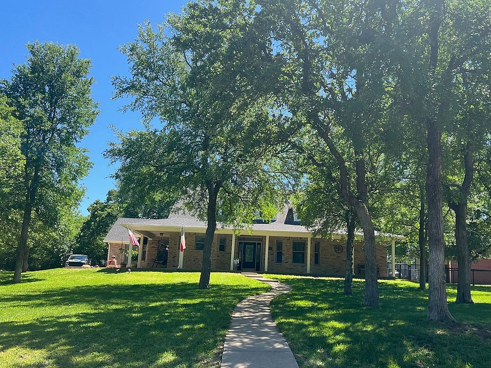Excellent location of this 4 bedroom 2 bath brick home located in Timber Ridge development - Home is located on wooded .63 ac outside the city limits - Corner lot - Built in 2006 - Custom awnings - Large family room with woodburning fireplace - Kitchen and dining room open to family room - Kitchen has granite tops and center island - Pantry - Primary bath has double sinks, garden tub, separate shower and large walk-in closet - Baths have granite countertops - Total electric - Lawn sprinkler - Covered patio - Fenced yard - Aerobic septic system - Side entrance 2 car garage and circular drive - Storm shelter located in garage - Property has 2033 sq ft. (YCAD) - Property taxes are $5259 without exemptions (YCAD)
