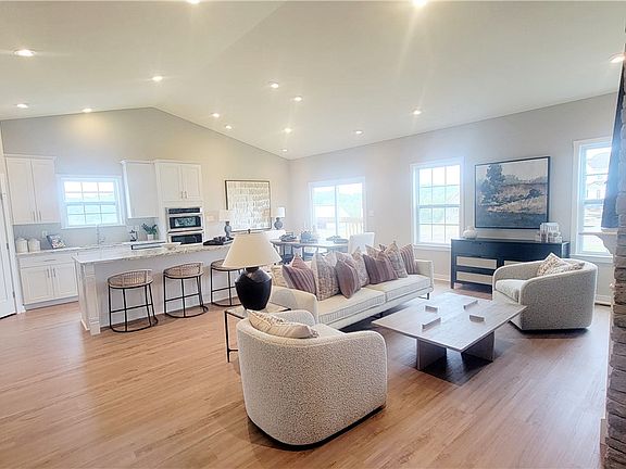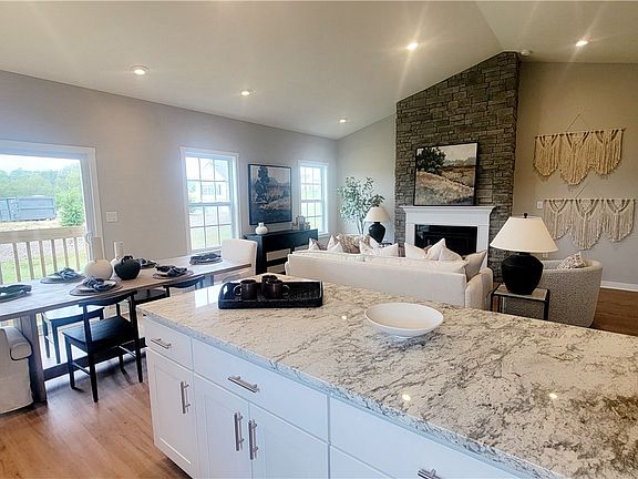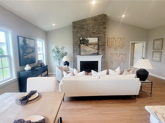 New Construction move-in ready home in Butler County! This charming craftsman-style Sanibel B offers the convenience of single level living in a spacious 3 Bed- 2 Bath design. The open-concept living area features a stunning cathedral ceiling with floor-to-ceiling stone gas fireplace and luxury vinyl plank flooring flowing throughout the common areas. The upgraded Chef’s Kitchen showcases a large island with ample seating space for entertaining, granite countertops, ceramic backsplash, gas range with hood, wall oven and microwave & upgraded cabinetry. Additional upgrades include: an enormous walk-in tiled shower with glass doors, body bar, rainhead and bench, an upgraded interior trim package with crown moulding, window casings and 36” interior doors, added dimmable lighting throughout, media taps and an unfinished basement with tons of storage and plumbing rough-ins for future bathroom.