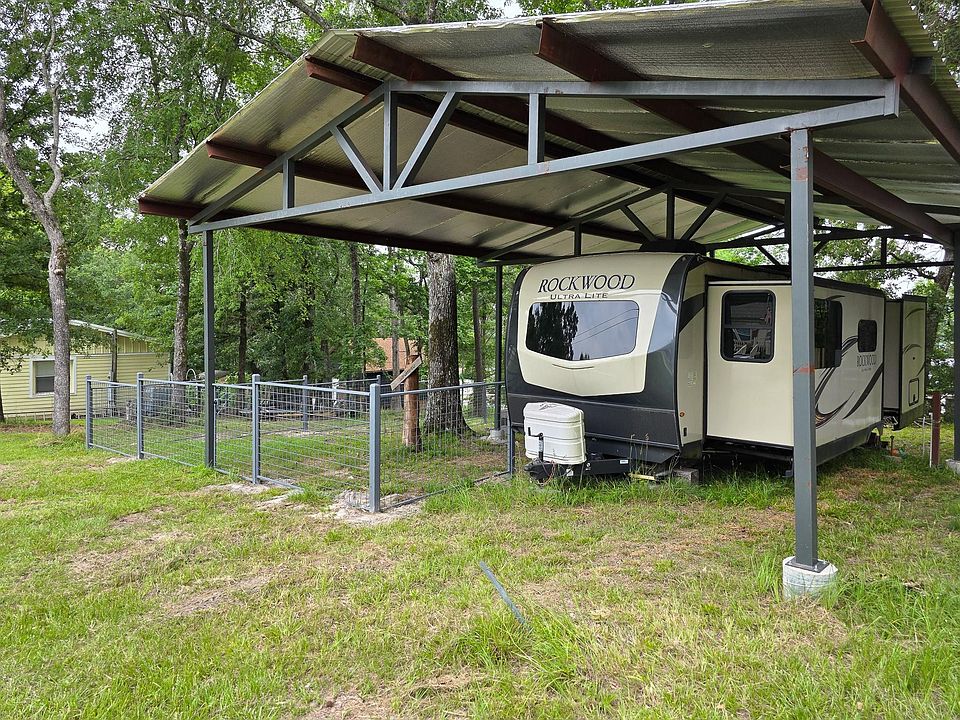 Experience the ultimate blend of comfort and convenience with this 0.25-acre property, perfect for a weekend getaway or a full-time lake retreat. Nestled within an attended, gated community near Lake Livingston, this property features an impressive 45x30 industrial-grade insulated metal structure that shelters a 2019 26’ Rockwood Ultra Lite RV with dual slide-outs.