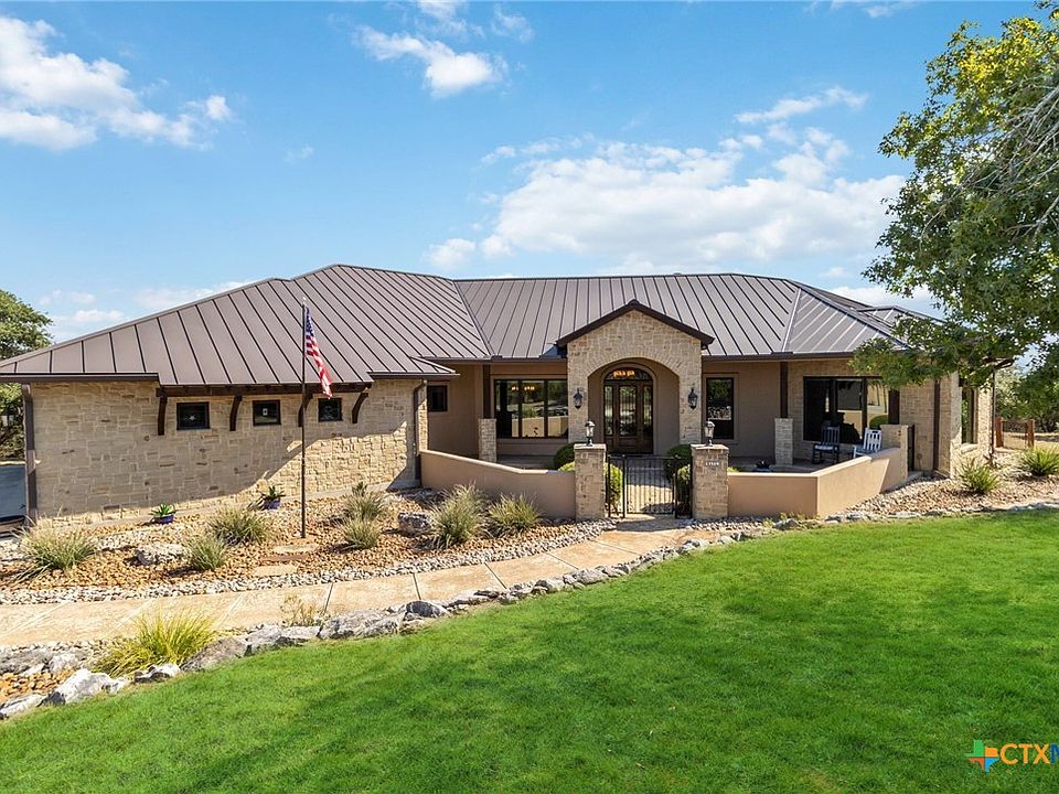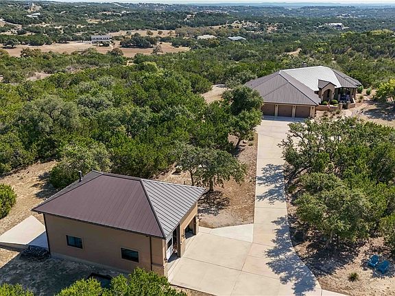 Discover your sanctuary in the Hill Country on 17.6 acres of breathtaking landscape. This custom-built marvel by Keith Wing covers 4,096 sq ft, featuring four bedrooms, a wine room, one bedroom being used as a large office with custom cabinetry, three full bathrooms, one half bath, a three-car garage, plus a detached RV garage with ample space for an RV and more, including a workshop and loft with a 3/4 bath. Iron gates open to a private courtyard with a water fountain and rocking chairs, offering a peaceful retreat. Inside, an open floor plan with a spacious living room showcases large Marvin custom windows overlooking the picturesque pond and grounds. The entrance greets you with intricate tile mosaics and stone walls, exuding warmth and character. At the heart of the home is a vast kitchen with oversized windows that reveal the backyard, featuring a large walk-in butler's pantry, coffee bar, and premium Electrolux appliances. Knotty Alder custom cabinets and soft-close drawers provide extensive storage, complemented by bar and island seating ideal for socializing. Two dining areas and a wine room capable of storing up to 300 bottles make hosting seamless. An outdoor kitchen under a charming pergola invites open-air dining and social events. The master suite includes an elegant foyer that leads directly to the serene backyard and pond. The three-car garage, connected to a workout room, offers a secluded space for fitness or hobbies. While the property is set up as a private sanctuary, it also offers potential for many different pursuits, all under the benefits of the wildlife exemption. Positioned between San Antonio and Austin, this estate is a stone's throw from Wimberley, the historic Gruene Hall, and Canyon Lake. This remarkable estate offers the ultimate in Hill Country living, combining luxurious features, breathtaking views, and exceptional privacy. Whether you're looking for a peaceful retreat or a home for entertaining, this property has it all.