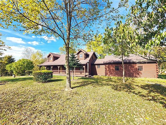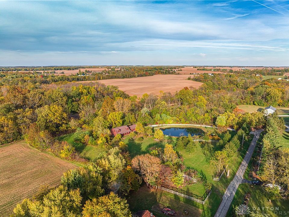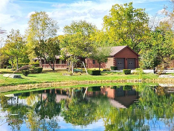 Beautiful and secluded Log Home built in 2000 located on 4.8 acres with stocked pond, woods and small stream plus over 2,100 SF with a first-floor master suite and laundry and covered front & back porches. This custom true log home features an open main living area with 2-story vaulted ceilings separated into a large front living area, attached kitchen and formal dining area. The first floor also features a side entry from the attached 2-car garage, laundry room with half bath, and 2 separate interior stairways into the full unfinished basement. The first floor master suite includes an all-wood bedroom with master bathroom including a jet tub and walk-in closet. The second floor includes a guest suite including a bedroom and attached full bathroom with shower and an open study and open walkway loft both overlooking the main living area. The full unfinished basement w/poured foundation walls includes a roughed-in bedroom area and lots of extra storage and built-in shelving. A 3rd bedroom can easily be finished in the basement (with 2 interior stairway egresses) or the 2nd floor study can be enclosed into a bedroom. The woodwork is magnificent, and you have to see it in person to appreciate it. The property also features a board-fenced paddock area for horses & other livestock, and the rear of the property includes a mixture of woods, grassy area, and small stream. This is a perfect location for hunting, fishing and other country fun only minutes from US 35 with easy access to Dayton, WPAFB, and surrounding areas. Also close to I-71 for easy access to Columbus & Cincinnati. Seller is leaving original spare materials & stain for future use by the new owner. This is a one-of-a-kind property in the area. Property is selling to settle an estate.