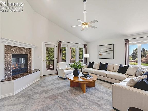 Low-maintenance living at its finest. Welcome to the best location in the highly sought-after Village at Peregrine Community. This lovely single-family home is at the end of the cul-de-sac where privacy and peacefulness abound. The main level provides an open floor plan with vaulted ceilings and lots of natural light. Here you will find the living area, dining, kitchen (with breakfast nook), and master bed and bath. The main level also includes a second bedroom which could be used as an office and 3/4 bath. Walking down a spacious open staircase to the lower level, you'll find a large family room with gas fireplace, two nicely sized bedrooms and a full bath. All bedrooms have walk-in closets ensuring you will not lack for storage space. The two outdoor living areas provide beautiful serene views of open space and roaming deer. There is a large deck off the living room and master and a private paver patio on the lower level. Don't miss the chance to live in this premier location near Blodgett open space, close to I25 and Woodmen Valley Park. HOA takes care of trash, snow removal, and yard maintenance so you can relax and enjoy this beautiful location and home.