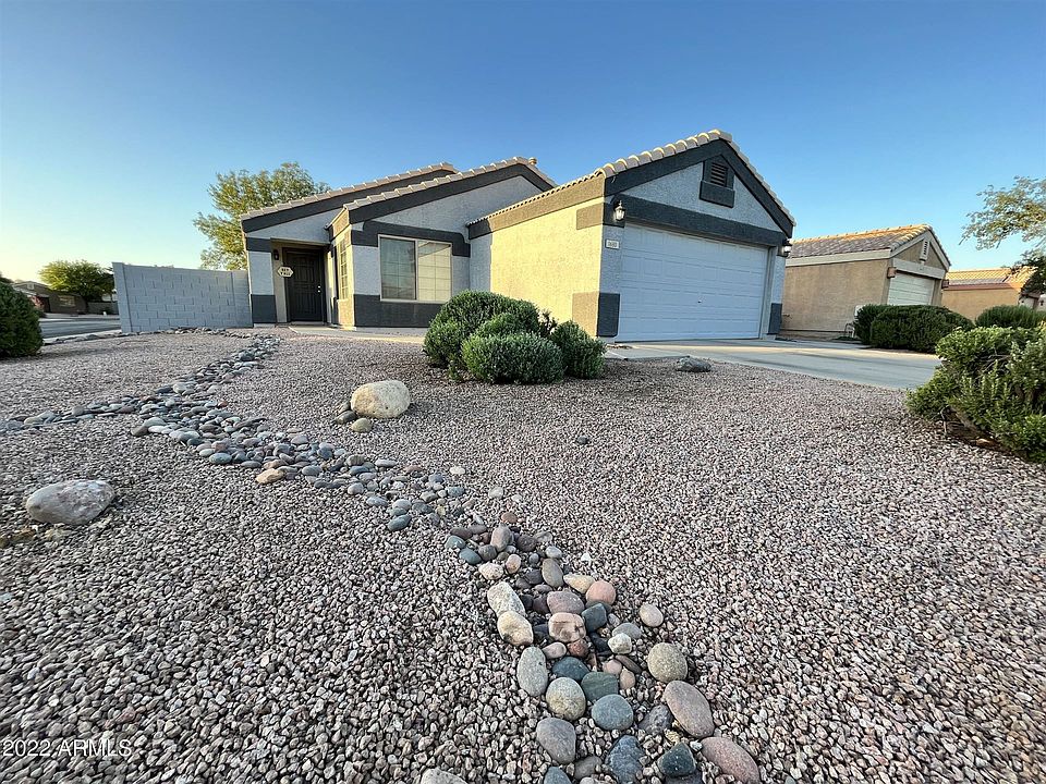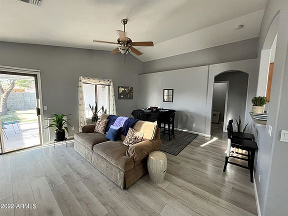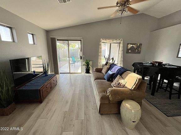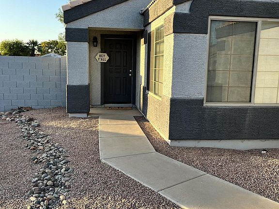 Ready to live in now! Premium corner lot in prime location. Open floor plan. Luxurious vaulted ceilings greet you at the entrance with natural light throughout the house. Living room offers a view of the grass yard through the large sliding patio door. Eat-in kitchen boasts newer stainless steel appliances (2019) & ample storage complete with island & breakfast bar to the living room. Laundry conveniently located between the bedrooms. Both bathrooms have a full size tub. En suite bathroom has separate vanity area and walk-in closet off dressing area in the spacious bedroom. Private exit to covered patio makes it easy to enjoy the outdoors. A/C replaced 2016 & hot water heater replaced 2019. New desert plants & watering system for backyard 2022. 2-car garage! Agent related to selling entity