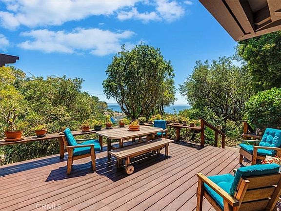 This home is a quintessential cottage in the woods and it is less than a mile from the ocean. Built upon 8 ocean view lots on Lodge Hill, this south facing home is surrounded by a secret garden of mature oaks, ferns and meandering pathways. It is an artistic cottage, beckoning you to create, to be a maker. Built in 1951 its most recent owner was Eleanor and Henry Kluck, a prolific and famous textile designer and an architect. This home inspires, it has an aura of creativity, it feels like a secret space in a hidden world. The large deck surrounding the home is an integral part of its function providing outdoor living space open to the sky, and access to the guest home and studio under the covered section. A giant Oak tree stands guard between the main home and the guest area. All of it has sweet ocean views. The home and guest home are a wonder of wood and have a feeling of yesteryear. Knotty pine wood walls, vaulted and beamed wood ceilings, and wood windows. A peek of ocean view is had from most windows. The main home has a corner brick fireplace in the living room, while just around the corner, the kitchen and dining room are combined into an open space with views to the deck, the trees, the sea. There is a walk-in pantry and a door to the deck. The primary suite is up one flight of stairs, providing wonderous views of the trees, gardens and ocean. Functional closets are tucked everywhere, hidden to look like the wood walls. Across the deck is the guest portion and studio of the property. Two Bedrooms, one bathroom in the guest quarters. Once again, wood walls, angled wood ceilings, clerestory windows, ocean view, and double French doors lead to the deck. Below this is a 425 sq ft art studio with half bathroom. Part of the studio is a glass atrium capturing sunlight and inspiration. Much of the property is undeveloped and private. There are two sheds for outdoor storage and many areas to sit in the sun or dappled sunlight.