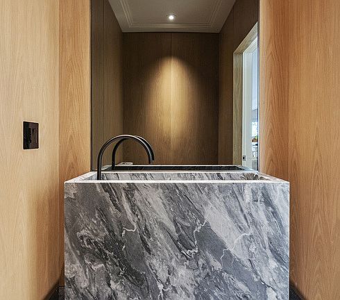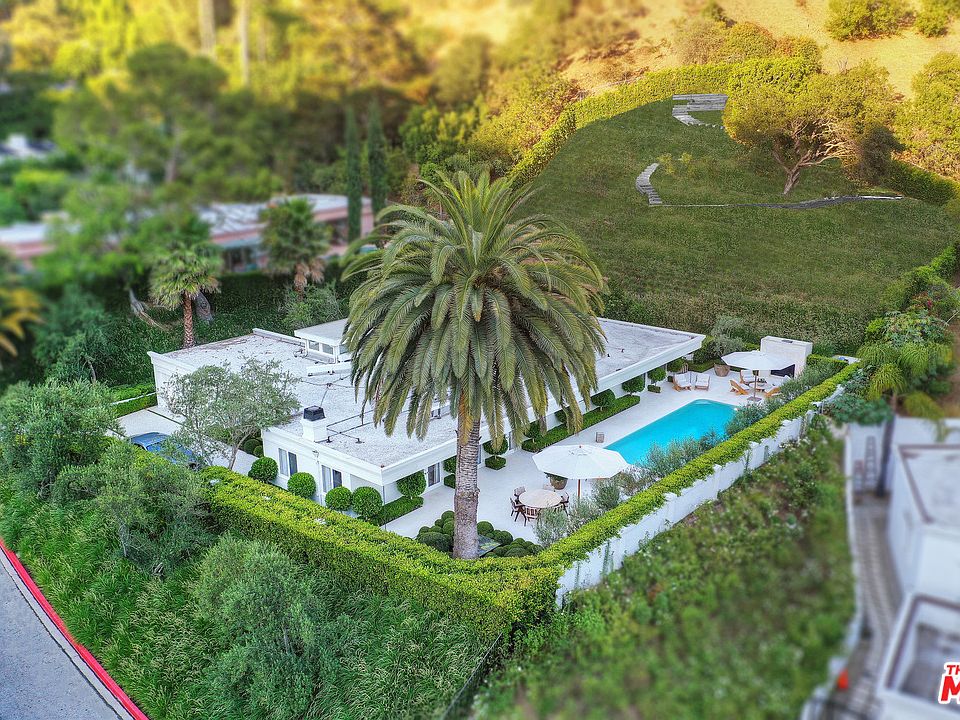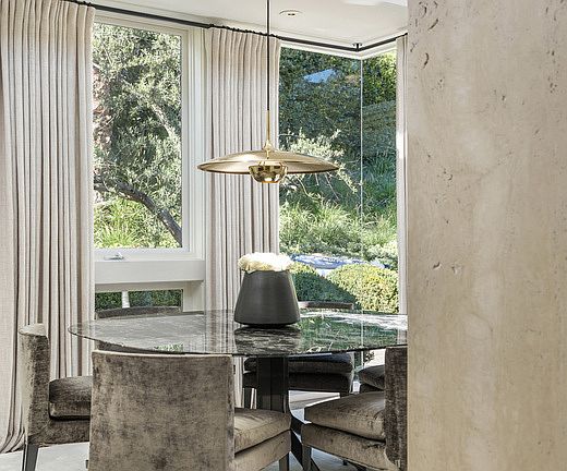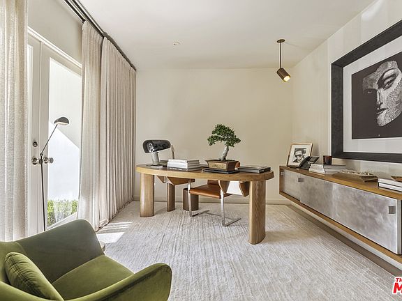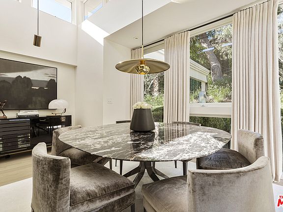Perched above the Sunset Strip sits this single-story, gated estate with elevated design and tastefully curated, European interiors. All materials, furnishings, details, and lighting have been meticulously selected to create this unique experience. Travertine accents, oak panels, and brass lighting create a sophisticated experience. Driveway and motor court is lined with boxwood hedges, olive trees, and a lily pond. The pool area is built of a soft cream limestone. Sleek steel and glass French doors open up to elegant living space and oak and travertine kitchen. Sun-drenched dining room with walls of glass exposes greenery. Refined master suite features fabric wallpaper, beamed ceilings, and views of the pool. Powder room is complete with oak panels and gray marble. Understated architectural landscaping, natural stones, variety of wood, steel, and brass create a true sanctuary.