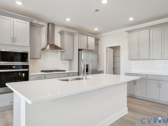 The gourmet kitchen is a standout with a large kitchen island, quartz countertops, soft-close cabinets, and premium stainless steel appliances, including double ovens, gas cooktop, Whirlpool appliances, and a walk-in pantry. This modern kitchen is perfect for both cooking and entertaining.