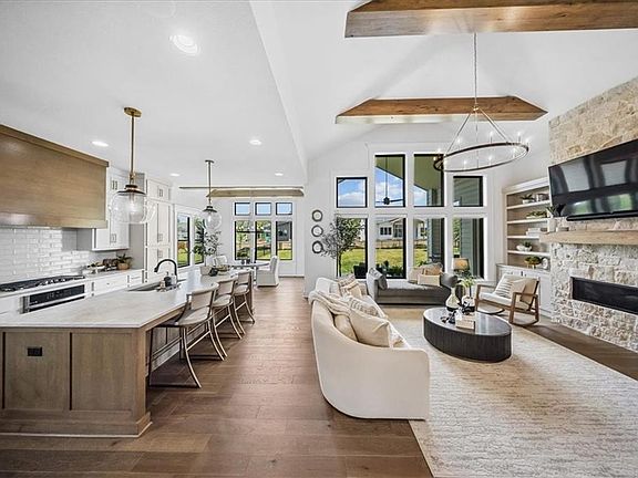 Welcome to luxury living in sought-after Century Farms! This stunning 1.5-story, 2 yr old home, blends timeless elegance with modern design and is packed with high-end upgrades that set it apart. Bathed in natural light, the open layout features soaring vaulted ceilings with rustic wood beams and 8’ interior doors for a grand, airy feel. The gourmet kitchen with prep area, double ovens, large pantry and spacious great room flow seamlessly to a large vaulted covered patio—perfect for entertaining or relaxing outdoors. Recent Updates include: custom window treatments throughout, fenced backyard, a water softener and epoxy garages.