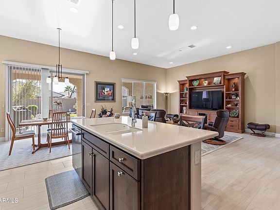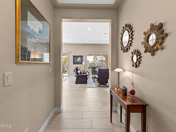 Step into this pristine home welcomed by beautiful tall ceilings that let in natural light and beautiful views of the custom backyard landscape. Garage and golf cart garage are finished with epoxy floors and custom cabinets for extra storage, Kitchen & baths feature upgraded cabinets, quartz counters, full height classic backsplash, 2 1/4'' Crown moulding above kitchen cabinets, SS appliances with gas slide-in range. Master bath has a gorgeous tile surround and base with rainfall glass enclosure. Master bedroom is spacious with bay window, Laundry room is fully appointed with upper & lower cabinets and counter workspace. Flooring includes neutral Upgraded 12 X 24 Tile. NEWLY Painted Exterior Jan 2025. See it to appreciate all the right upgrades. Stonecreek Media Center is available outside escrow via Bill of Sale.