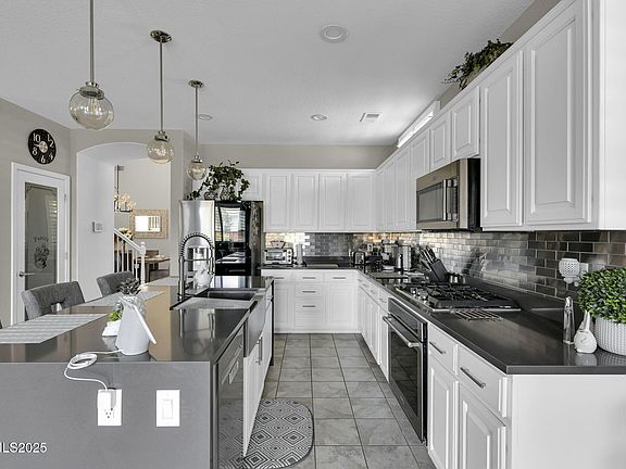 Discover the perfect blend of comfort and convenience at 1681 Emerald Bay Drive, located in the highly sought-after Double Diamond community. This beautifully upgraded home offers modern finishes, spacious living, and a prime location near the freeway, top-rated hospitals, and shopping centers. Whether you're entertaining guests or enjoying quiet evenings at home, this property provides the ideal setting. Perfectly situated so you never have to shovel snow, thanks to its ideal positioning. Remodeled in 2022-2023 with Extensive Upgrades and Ideal Location • Interior Renovation (2023): Full interior paint, updated flooring throughout the main living areas with wood laminate, and new 5.5" baseboards. • Fully Renovated Kitchen (2023): Includes quartz countertops, soft-close cabinetry, a farmhouse sink, custom backsplash, new appliances, stylish light fixtures, and an extra-large pantry with frosted glass door. • Lighting (2023): All new light fixtures, including dining room, kitchen island pendants, and modern stainless steel ceiling fans. Recessed LED lighting throughout the home. • Fireplace & Built-ins (2023): Custom fireplace surround with built-in shelving, adding both function and style. • Bathrooms (2023): All bathrooms remodeled with large 12x12 tile flooring, full-height shower tile, quartz countertops, decorative tile backsplash, and upgraded plumbing fixtures. • Closets (2023): Spacious walk-in closets in both the primary and spare bedrooms, customized by Closets of Nevada. • Window Coverings (2023): Plantation shutters in the living room, family room, and loft. • Smart Home Features: Smart-enabled front door, lighting, and heating system—fully controllable via phone app or manual controls. • Security System: Includes interior and exterior cameras with active alarm system. • HVAC & Maintenance: HVAC and air conditioning systems have been serviced annually by Sierra Air. • Electrical Upgrades: Upgraded electrical throughout the interior and exterior, including rooftop outlets for convenient holiday lighting. • Water Heater: Brand new water heater installed in 2025. • Garage: Built-in shelving added in 2021 for extra storage and organization.