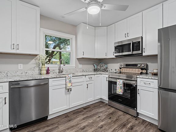 This fully renovated brick ranch offers 3 bedrooms, 2 baths, and timeless charm blended with modern updates. Set on a landscaped lot with mature trees, it features a brand-new roof, windows, and HVAC (2025), refinished hardwood floors, and a completely remodeled kitchen with abundant storage. With no HOA and plenty of character, this home avoids the cookie-cutter feel of new construction. A spacious 2-car garage, thoughtful updates throughout, and true move-in ready condition make it a standout. Conveniently close to Leland's city center, minutes from Wilmington and major highways, you'll love the perfect mix of comfort, convenience, and peace of mind.
