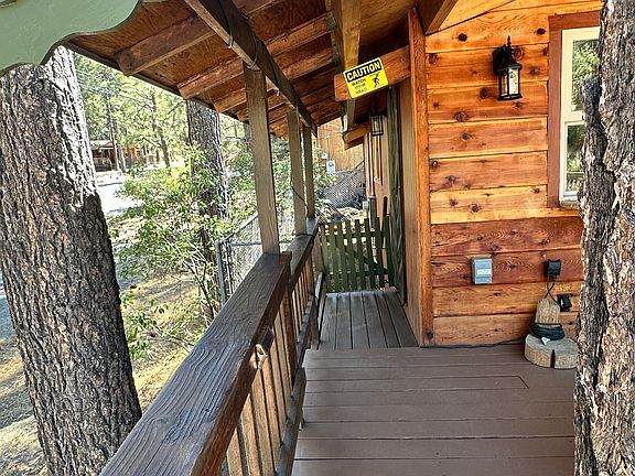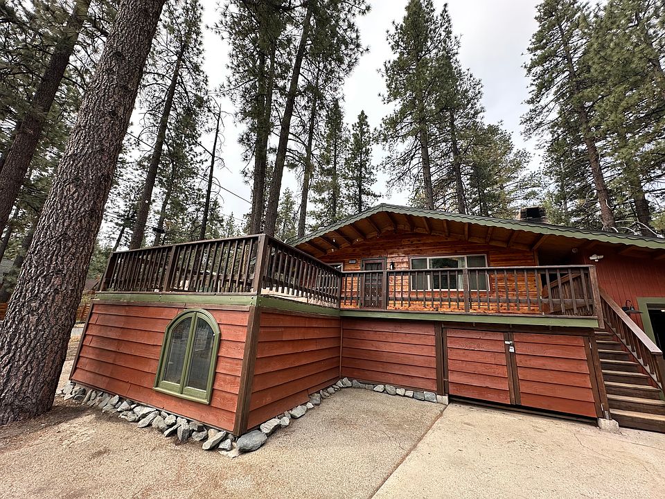 Fully furnished Mountain cabin property. Corner lot property. Surrounded by pine trees and mountains. Includes a hot tub on a wood deck for relaxation. Freshly painted cabin. Skylights help bring life into space in each room. Spacious garage. 10min walk to the village and 10min drive to Mt High Resort.