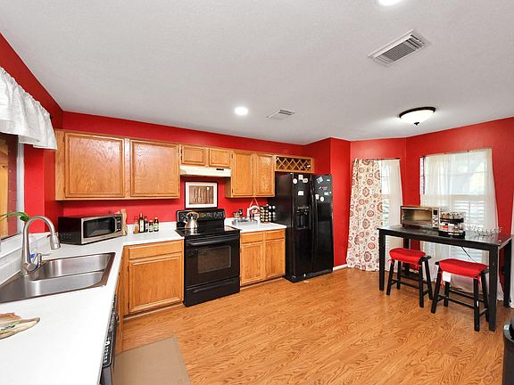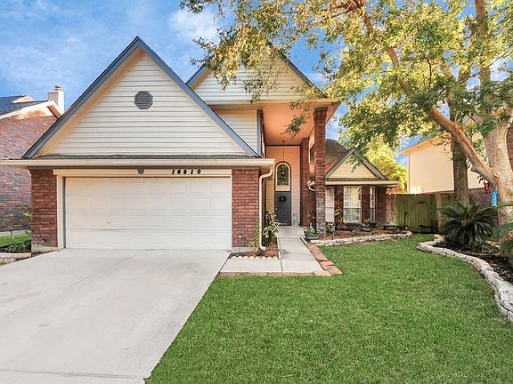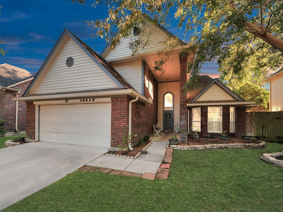 Welcome to 16810 Goodfield Court, a spacious two-story home located on a quiet cul-de-sac in the desirable Champion Woods at Colony community. This property offers 4 bedrooms, 2.5 bathrooms, and a 2-car garage. The open-concept layout features vaulted ceilings, a cozy brick fireplace, and a kitchen with ample cabinetry, breakfast bar, and a large window overlooking the backyard. The primary suite is downstairs with dual sinks, soaking tub, and separate shower. Upstairs includes three additional bedrooms and a full bath. Enjoy outdoor living with a screened-in sunroom, covered patio, wooden deck, and a private backyard oasis featuring a sparkling pool and spa surrounded by mature trees. Conveniently located near top-rated Klein ISD schools, shopping, and major roadways. HOME IS BEING SOLD AS-IS.