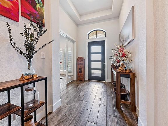 WOW! Luxury, space, and style come together in this stunning home, tucked away on a quiet cul-de-sac in ShadowGlen. Beautiful landscaping and strong curb appeal set the tone—but wait until you step inside! With 2,732 square feet, this well-designed home offers 4 bedrooms, 3 full bathrooms, an office, a media room, and an expansive living room ideal for everyday living and entertaining. The grand entry welcomes you with tall ceilings, 8-ft doors, gorgeous “woodgrain” tile flooring, wood shelving, and striking wood-look tray ceiling accents, details that continue throughout the home. An office features glass doors, a stylish brick-look accent wall, and floating shelves. Two spacious bedrooms with walk-in closets share a full bath, while a private guest suite enjoys its own en-suite bathroom. A flexible bonus room is ready to become any room that fits your lifestyle! The chef’s kitchen is the heart of the home, showcasing white cabinetry, a huge island with storage, gray countertops, gas cooking with pot filler, double ovens, and a walk-in pantry. Extra space for a coffee or wine bar! The kitchen opens to the luxurious living room. Walls of windows flood the space with natural light. The primary suite has a spa-inspired bathroom featuring a jetted tub, rain shower, dual vanities, and marble tile. A large walk-in closet includes a functional hidden passage to the laundry room. Additional highlights of the home include an over-sized two-car garage plumbed for a sink and prepped for EV, surround sound, security system, and a full water filtration system. Outdoor living shines with an enclosed Sun Room, a massive backyard, gazebo on a concrete slab, raised planting beds, and a heated cowboy pool. Solar panels, gutters, and a full sprinkler system complete the package. ShadowGlen offers resort-style amenities including a water park, fitness center, golf course, trails, sports courts, playgrounds, and clubhouse. Minutes from shopping and dining. An exceptional opportunity!
