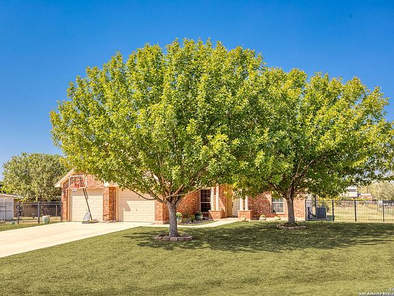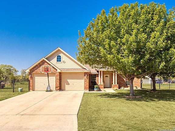 Fall in love with this 3/2, one-story, custom home on 1/2 acre in Elemendorf! Featuring spacious bedrooms, open living concept, and island kitchen with beautiful cabinetry! The primary bedroom has a large walk-in closet, separate shower, and garden tub. Situated within a cul-de-sac, the lot is fenced, has several mature trees, which include several fruit producing trees! Unwind in the evenings on the covered patio and watch the sunset or kids on playset! Close enough to San Antonio, Randolph AFB, Braunig Lake and more, but far enough to have a quiet country feel! Visit today and fall in love!