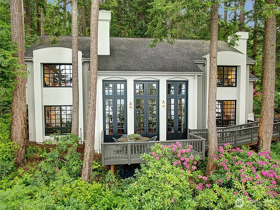 Tucked away on over 7 secluded acres, this rare coastal property offers 324 feet of private, west facing shoreline. Amazing location, 1 hour from Seattle, no ferry, and minutes to amenities w/ easy access to 3 airports. Panoramic bluff views of the Olympic Mountains and nearby islands. A private tram offers direct access to the beach below for true shoreline and boating enjoyment. This home combines Mediterranean flair with Pacific Northwest charm—featuring 14-foot wood-framed windows, wide-plank reclaimed fir floors, and three fireplaces. The original mission-style kitchen hearth remains, updated with modern amenities and luxury appliances. Striking architecture, native landscape, and timeless craftsmanship complete this private escape.