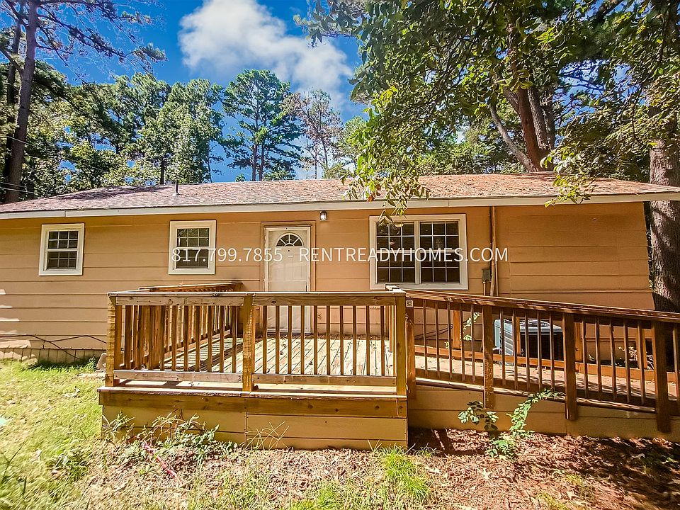 Outside, the home features a large wooden deck and ramp access, making it perfect for relaxing or enjoying the wooded surroundings. The fenced yard provides additional space for outdoor activities, pets, or gatherings.