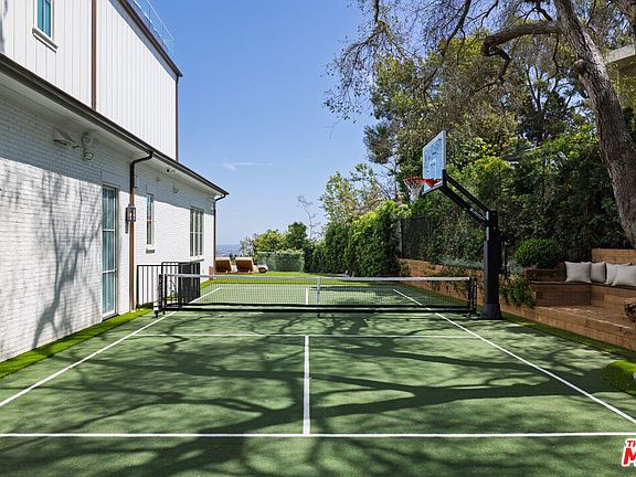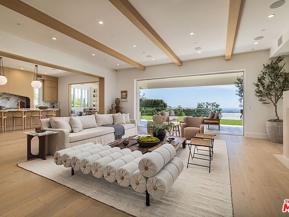 Perfectly poised in the prestigious Palisades Riviera just minutes from San Vicente and Brentwood, this newly completed architectural estate offers an unparalleled standard of living commanding sweeping ocean, city, and mountain views. Built by AMG Capital and Ortam Construction with interiors by the acclaimed Morrow&Co, this 10,400+ SF residence is a masterwork of design. From the moment you enter, soaring ceilings and walls of glass reveal a seamless connection to the grounds beyond, where curated landscapes frame a resort-style pool, expansive lawn, private pickleball court, and a rooftop deck with an outdoor kitchen capturing 360-degree views of the ocean, city, and mountains. Inside, elegant formal spaces unfold with an effortless indoor-outdoor rhythm, complemented by a state-of-the-art chef's kitchen, striking bar and lounge, two private offices, a dedicated wellness center with sauna and gym, and a grand movie theater. The expansive primary suite is a private sanctuary with a panoramic view balcony, dual boutique-style closets, and a resort-style spa retreat with soaking tub and oversized shower envisioned for indulgence and repose. Throughout, bespoke furnishings by Vesta Home, in collaboration with Olive Ateliers echo the architectural language of the home and are available for purchase. An oversized 10-car garage completes the estate, providing secure accommodation for an exceptional fleet. An estate of this caliber is a rare expression of privacy, design, and prestige in one of Los Angeles' most coveted locations.