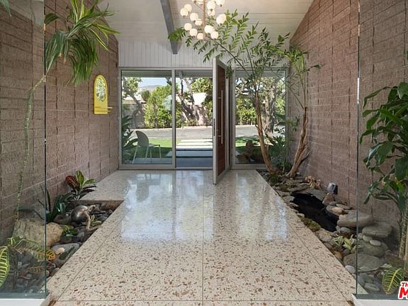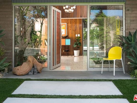 Situated atop a private flag lot in the Knollwood Country Club Estates of Granada Hills sits this exceptional Mid-Century Modern custom home. Located on a quiet cul-de-sac, the long private driveway reveals a gorgeous home with many unique features. Entering into the living space one finds gorgeous terrazzo floors, a grand dual-fireplace with statement chimney, soaring 17-foot ceilings, updated windows and doors throughout. The fabulous kitchen has been fitted with modern touches while maintaining its mid-century flair. Boasting 5 bedrooms, 4 1/2 bathrooms across over 4000 square feet, including a finished basement (that was once a bomb shelter!) this home is truly a statement piece. The covered patio area creates a wonderful indoor/outdoor living experience while featuring a free-form swimmer's pool augmented by a solar heating system that's perfect for entertaining throughout the year. The exterior is outfitted with new garage doors, custom front door, and electric vehicle charger.