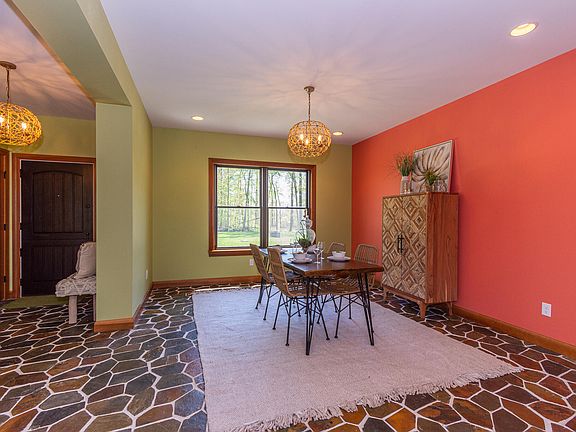 Motivated Seller. Discover modern comfort and natural serenity in this 2019 ranch-style home nestled on 10.228 acres. Enjoy the privacy of wooded surroundings while still being conveniently close to amenities. Inside, you'll find a beautifully designed space with natural slate, bamboo, and ceramic flooring, creating a warm and inviting ambiance. The kitchen features granite countertops, natural capiz backsplashes, and soft-close ceiling height cabinets with crown molding. The 9-foot ceilings and vaulted sunroom ceiling bathe the interior in natural light. Relaxation awaits in the spacious primary bath, complete with a soaking tub and a tiled walk-in shower boasting multiple heads and settings. The primary suite offers two walk-in closets for added convenience. Embracing eco-friendly living, the open loop geothermal heating and cooling system and propane backup ensure efficiency. Plus, two water heaters, a water softener, and a reverse osmosis filtration system enhance comfort. The partially finished basement provides 490 sq ft of flexible space with speckled epoxy flooring, storage cabinets, and an EZ Breathe ventilation system. While the oversized 3-car garage has a full bathroom and a tornado shelter (assembly required). Outside, a covered cedar and pine porch and concrete courtyard provide a perfect spot to unwind. The property is surveyed in two 5-acre parcels with a shared driveway and pad-mounted transformer agreement. This remarkable property offers the perfect blend of modern luxury and natural beauty. Schedule a tour today and embrace the unique opportunity to call this serene retreat your home.